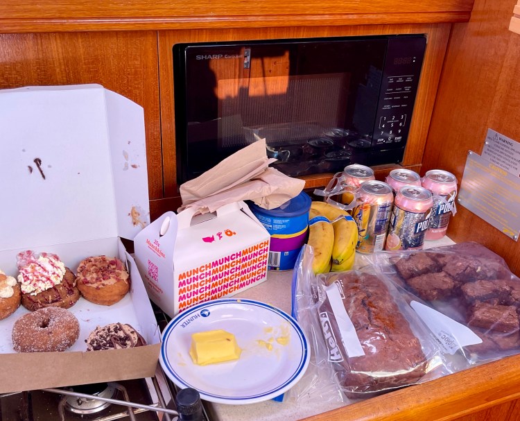 After a very healthy breakfast of donuts and croissants provided by the Elnitskys’ we set sail on Sunday morning. As you can see we intend to continue along the theme of healthy eating.