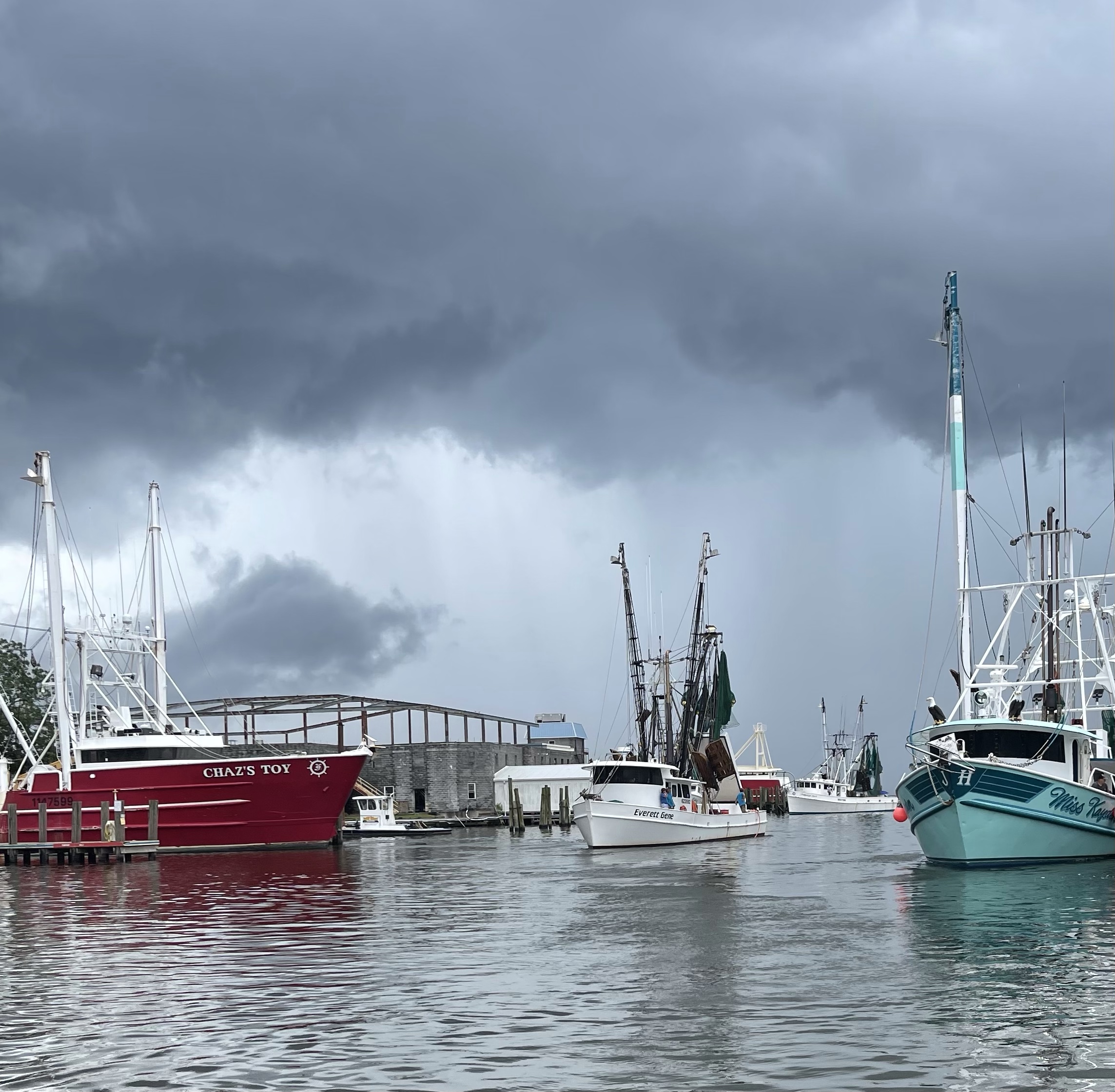 We are now in Oriental and the weather is still a bit iffy so we have decided to stay another day. As you can see from the pictures of the fishing boats leaving the dock, it may be ok for them but we think the sky looks a we bit iffy.