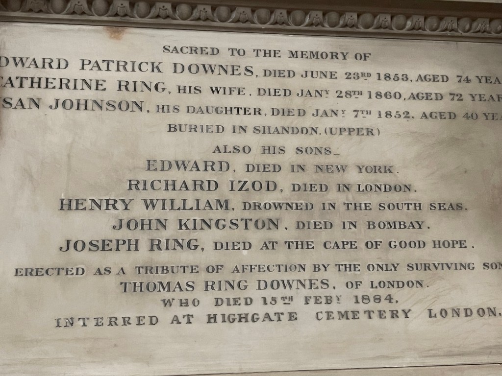 At the Shandon St Anne’s church built in 1722 you can climb the tower and ring the church bells. It’s a beautiful sound. It also stored old bibles and many sad monuments, one in particular to all the sons of a man what had died overseas. The son who errected the monument lived in New York. Sad times