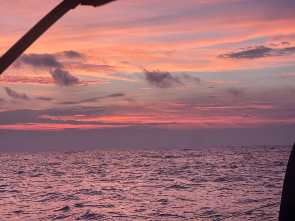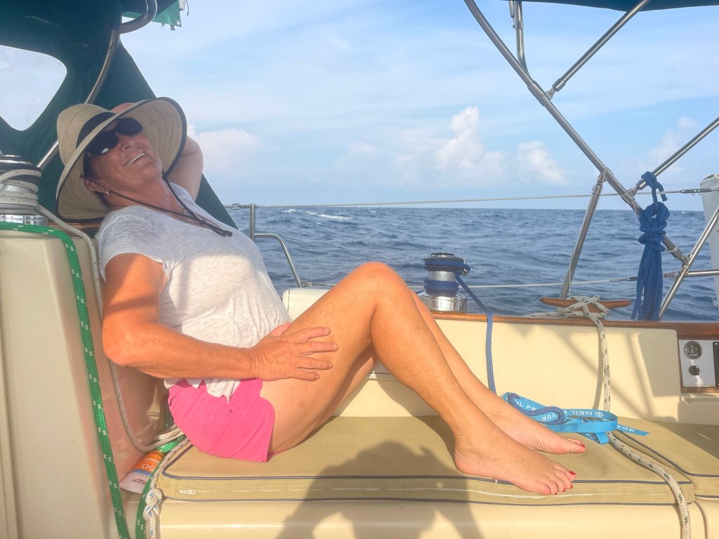 Once on the Gulf Stream the boat is carried by the current and it goes up to 10 knots from the usual 5. It feels like you’re on a magic carpet. And we were smack bang in the middle of it. The deepest blue color that is not replicated anywhere on land. I was in my new free hat from West Marine thinking I looked like Audrey Hepburn