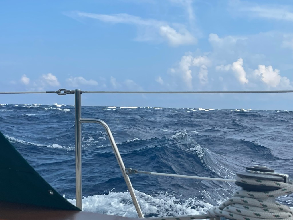The sea got horribly confused and lumpy. Wind directly behind us and a following sea. The line from ‘The Ballad of Edmund Fitzgerald ‘. The cook says ‘Fellows it’s too rough to feed you’ and in the next verse ‘fellows it’s been good to know you ‘ kept running through my mind. I had made stew before we set out and of course when I was heating it the pot flew off the counter. Not fun. But I followed the three second rule and didn’t tell the crew.